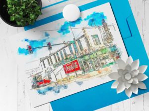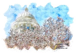 She Studios Arkansas Heritage Collection celebrates the Natural State with a collection of “watercolor like” designs from around Arkansas. Created digitally from original photographic images, these designs include local landmarks, public buildings, schools, colleges, universities, sorority and fraternity houses, hospitals, courthouses, bridges, National Register and National Historic Landmarks, and more. These designs are available as prints, note cards, ornaments, coasters, zipper bags, and other items.